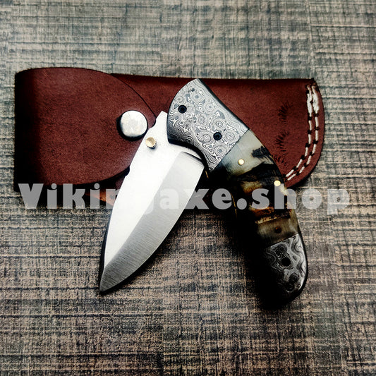 Damascus Steel Pocket Knife Ram Horn Handle VA-08