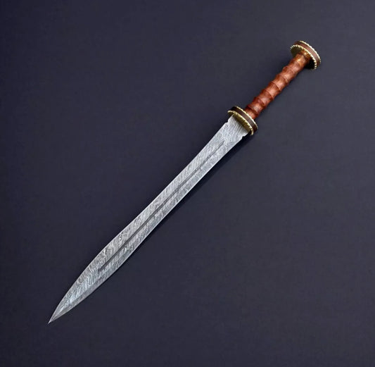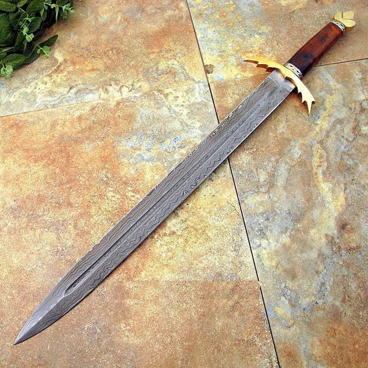 Viking Sword Damascus Steel Sword Brass Guard And Pommel Rose Wood Handle With Leather Sheath