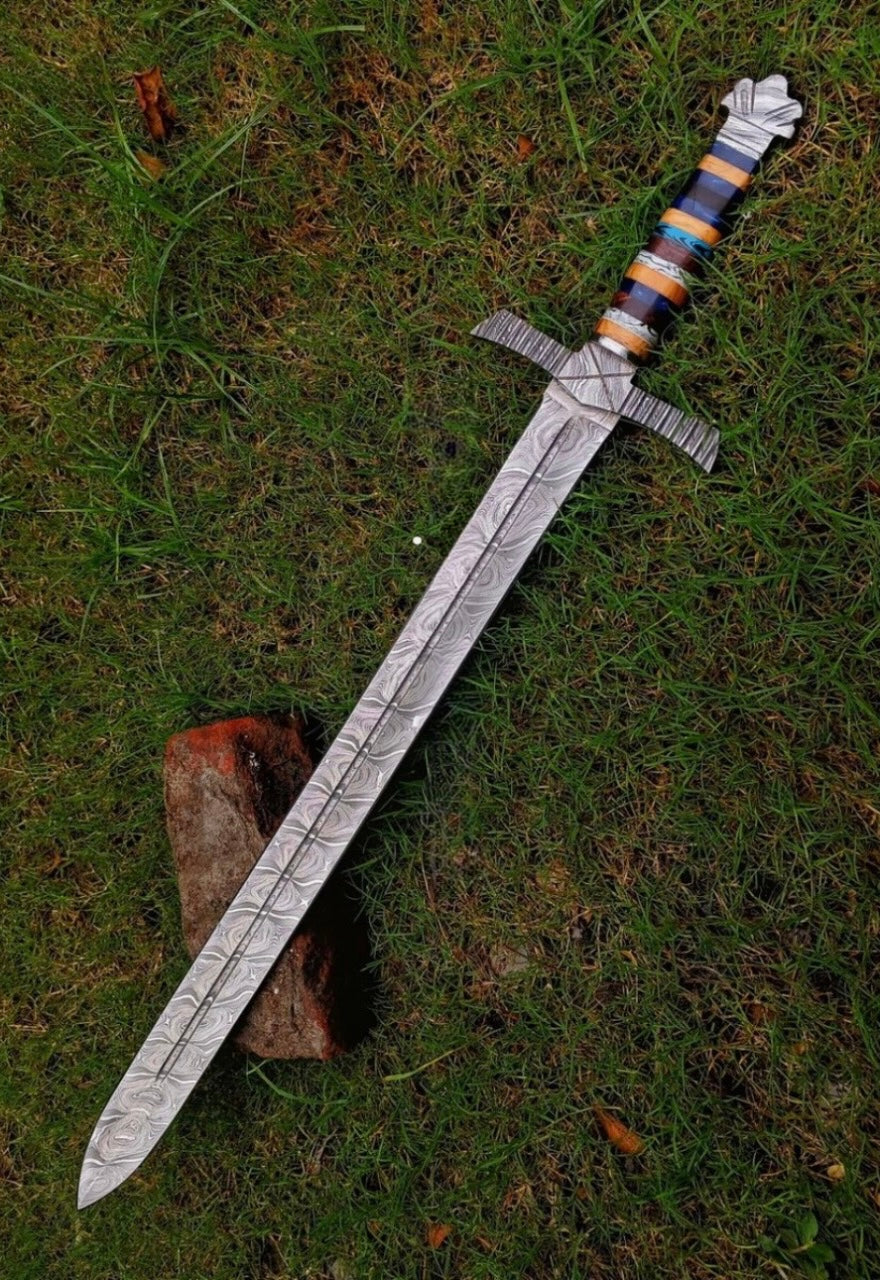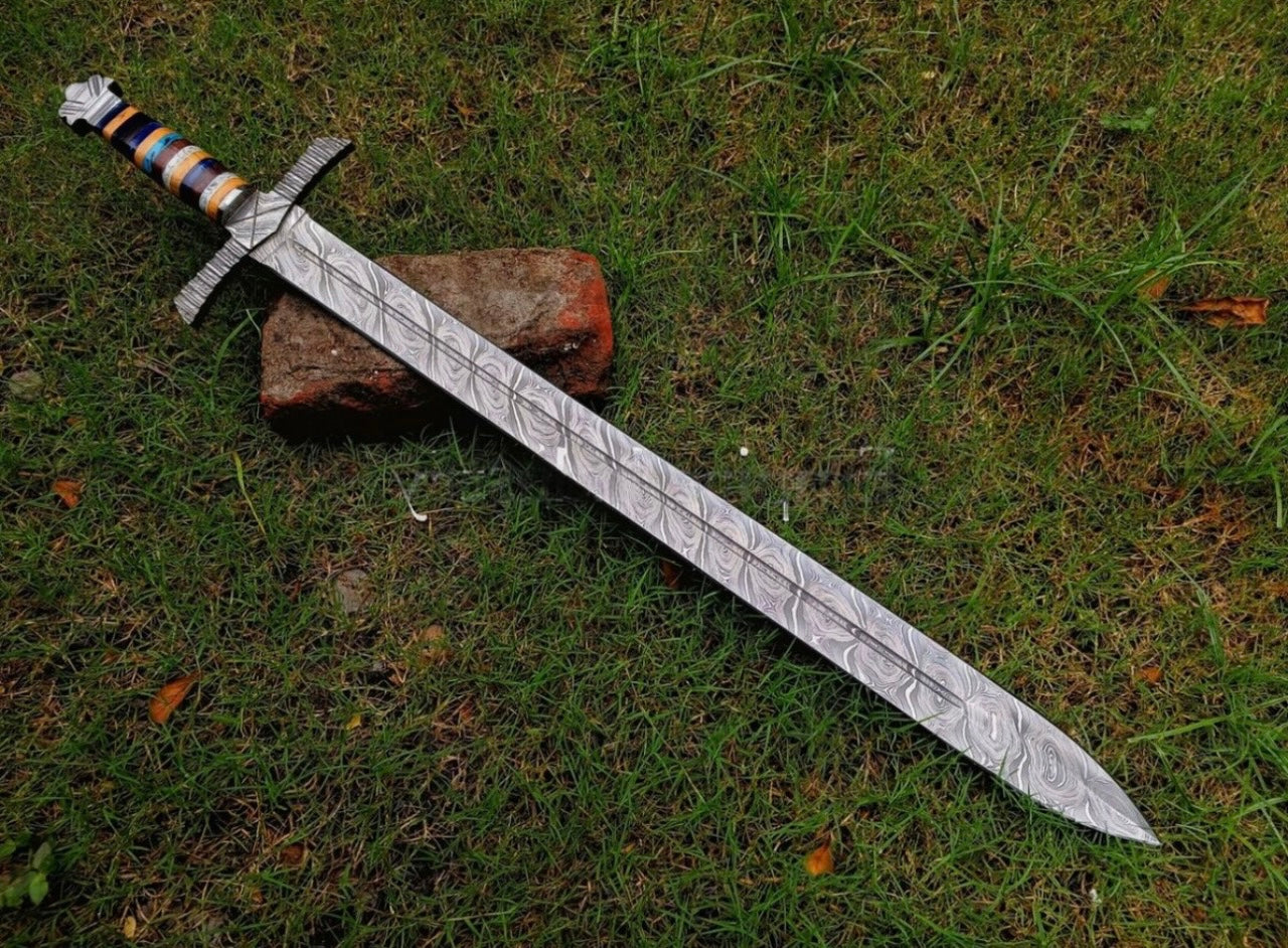 Damascus Steel Sword Crafted Handle Viking Sword Sharp Edges With Leather Sheath