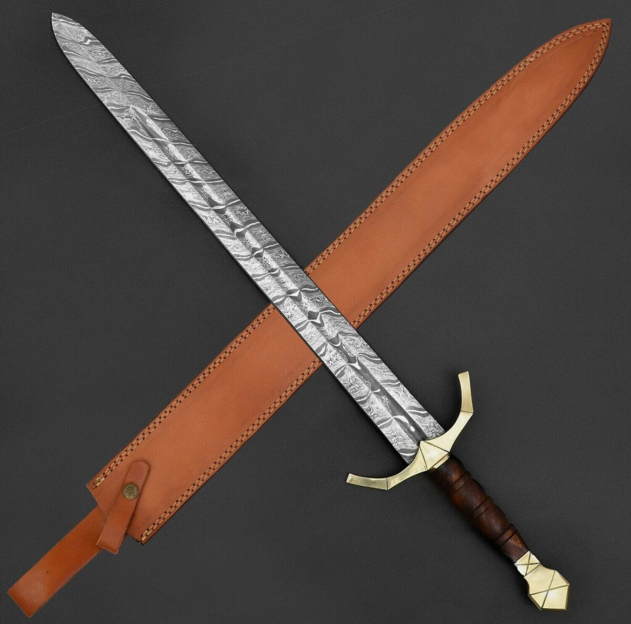 Damascus Steel Sword Rose Wood Handle Viking Sword Sharp Edges With Leather Sheath