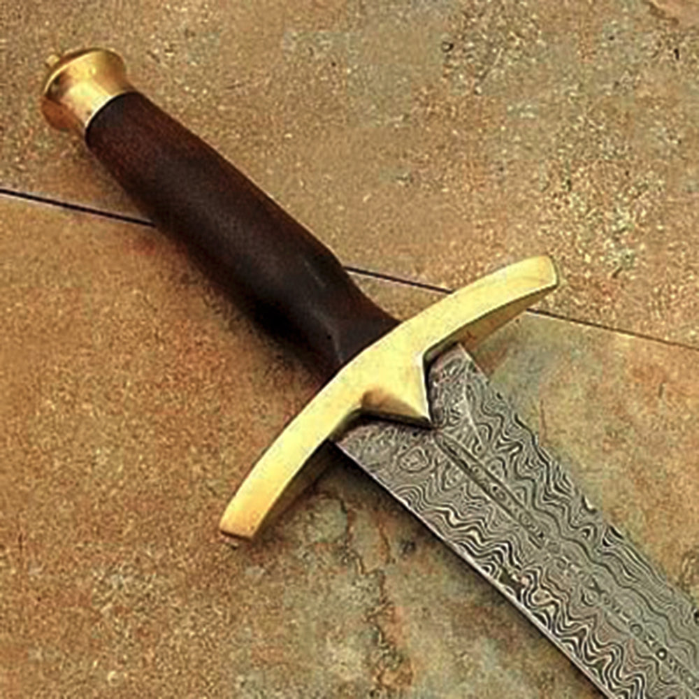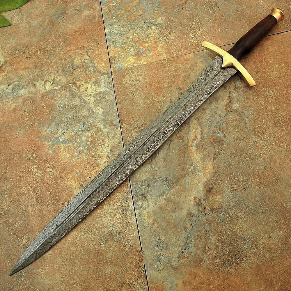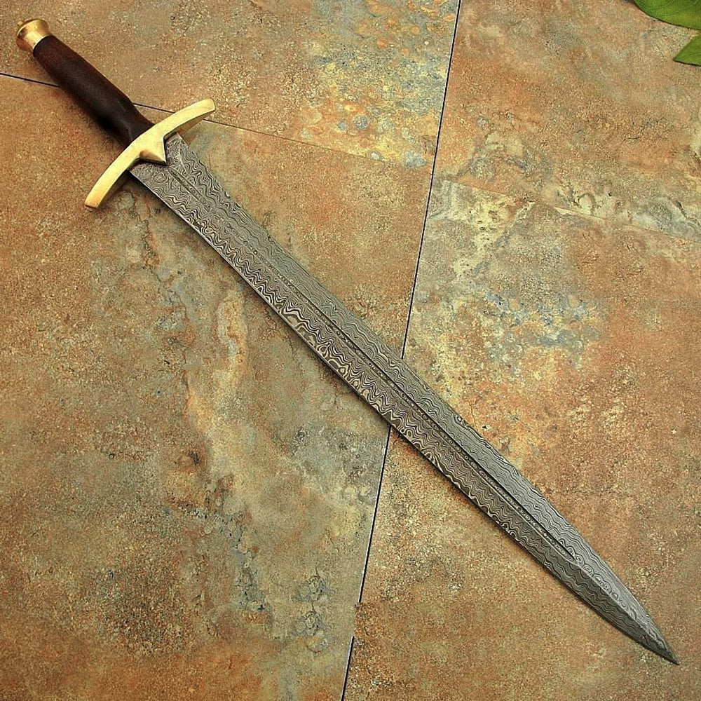 Viking Sword Damascus Steel Sword Brass Guard And Pommel Rose Wood Handle With Leather Sheath